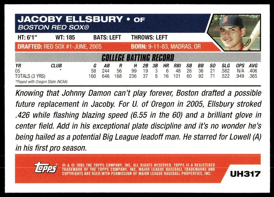 This Baseball card, from 2005 is part of the Topps Updates & Highlights card set. Jacoby Ellsbury is featured and has a card number of UH317.