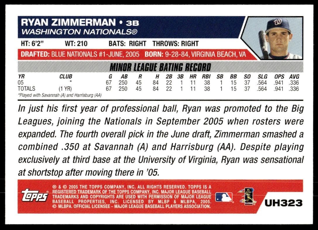 This Baseball card, from 2005 is part of the Topps Updates & Highlights card set. Ryan Zimmerman is featured and has a card number of UH323.