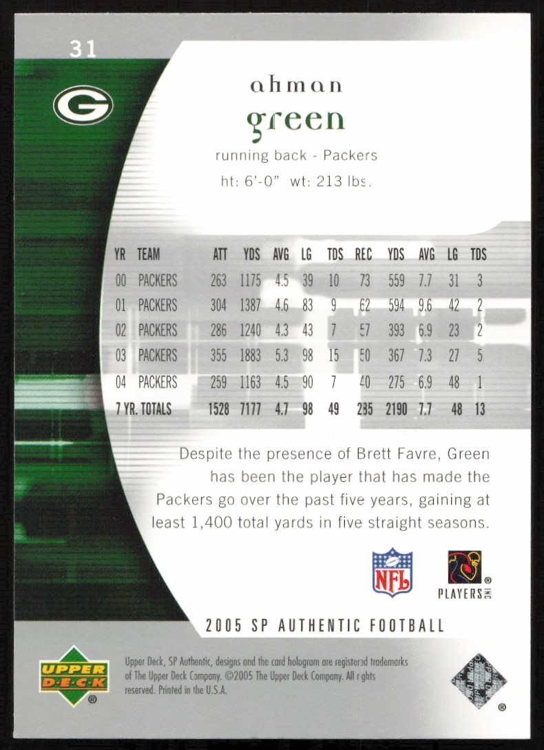 This Football card, from 2005 is part of the Upper Deck SP Authentic card set. Ahman Green is featured and has a card number of 31.
