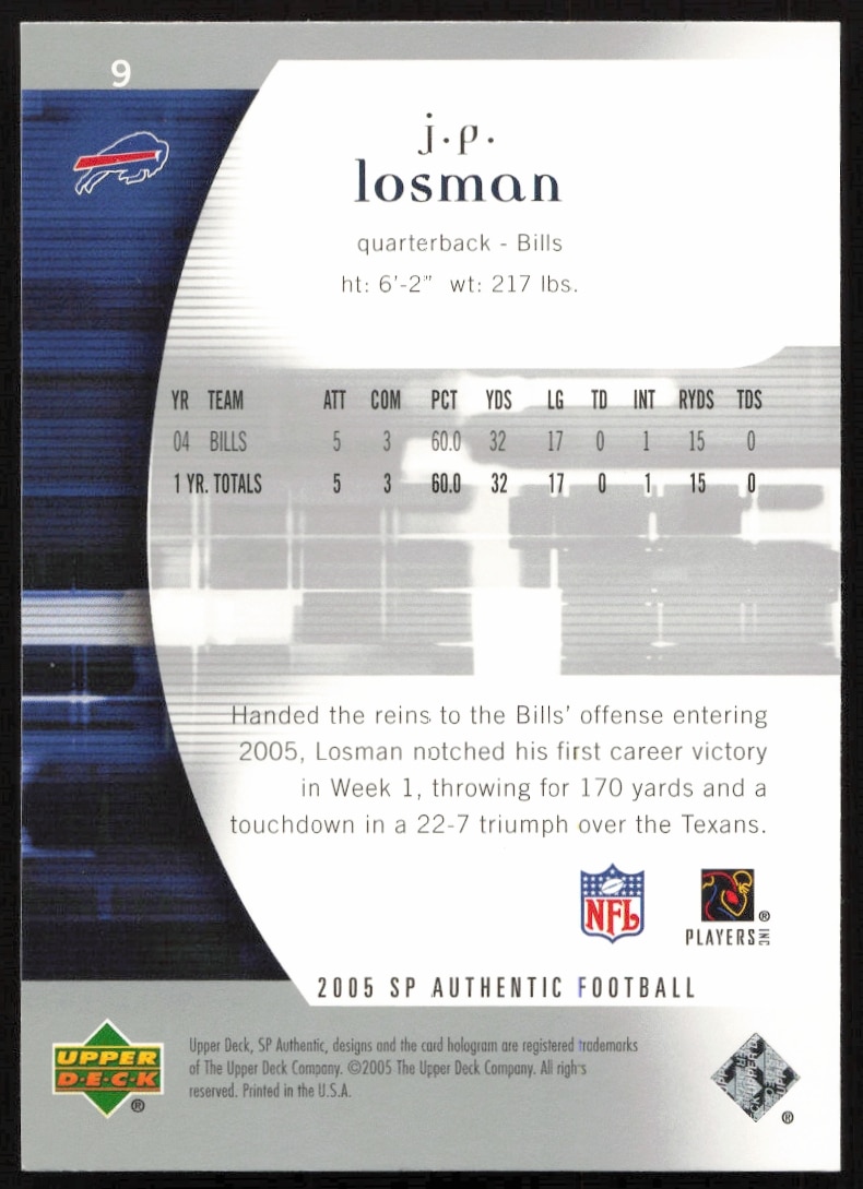 This Football card, from 2005 is part of the Upper Deck SP Authentic card set. J.P. Losman is featured and has a card number of 9.