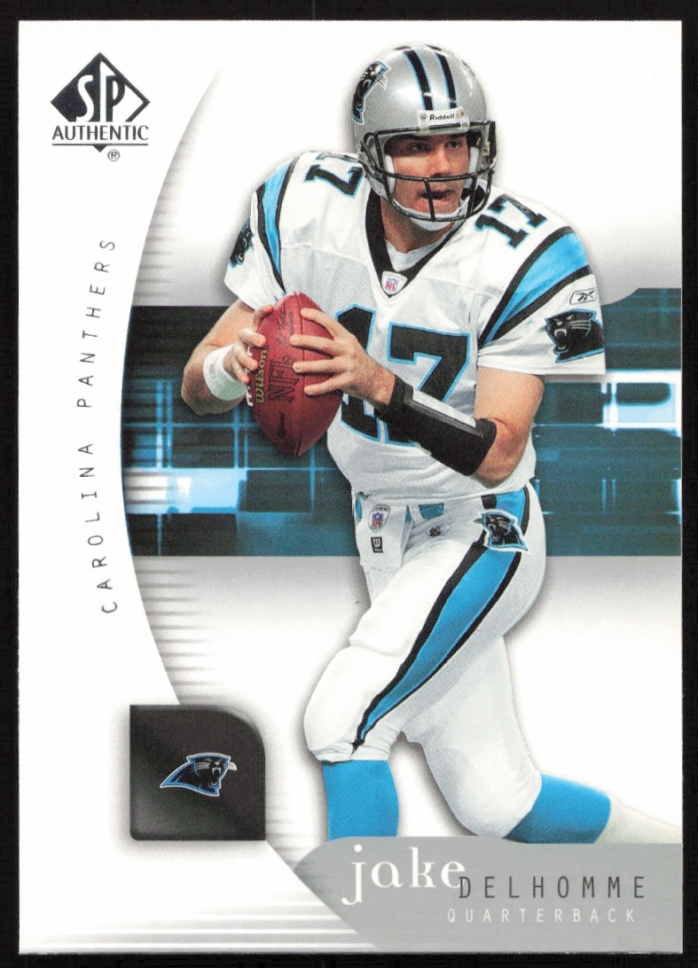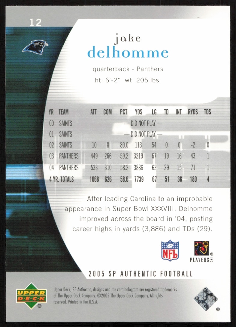 This Football card, from 2005 is part of the Upper Deck SP Authentic card set. Jake Delhomme is featured and has a card number of 12.