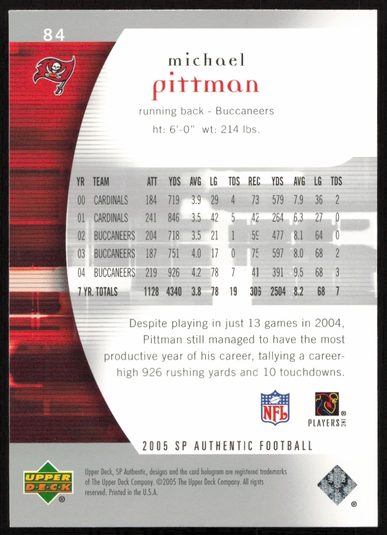 This Football card, from 2005 is part of the Upper Deck SP Authentic card set. Michael Pittman is featured and has a card number of 84.
