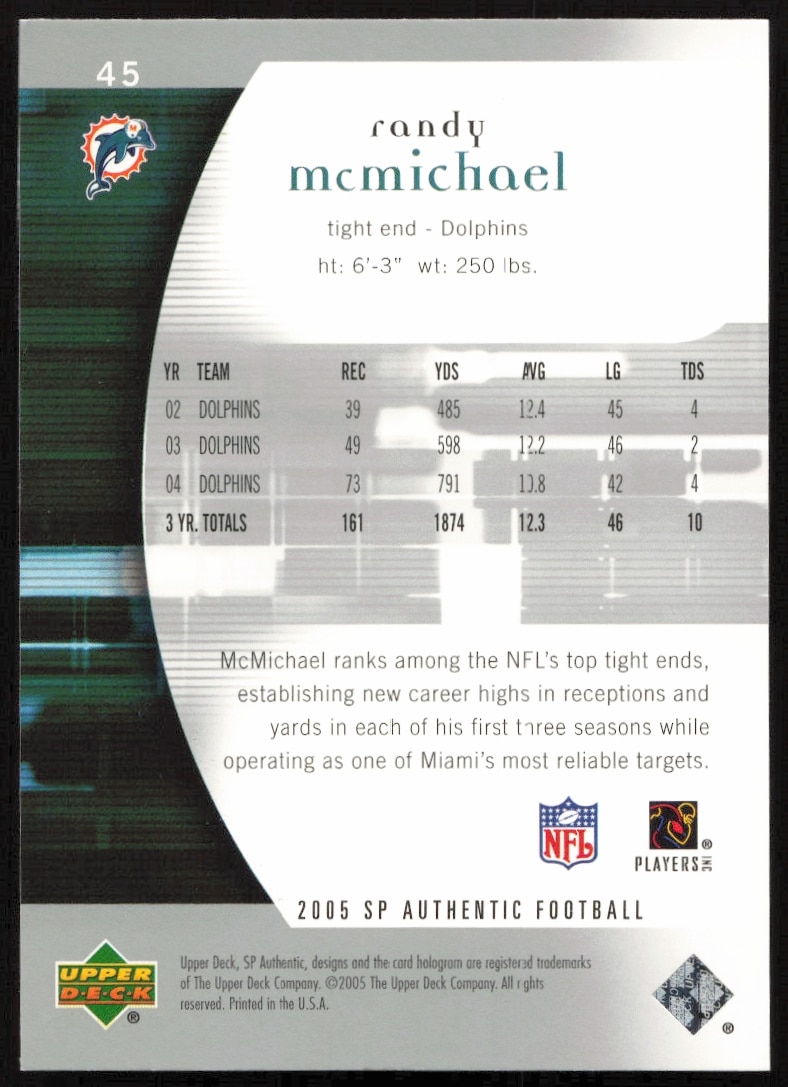 This Football card, from 2005 is part of the Upper Deck SP Authentic card set. Randy McMichael is featured and has a card number of 45.