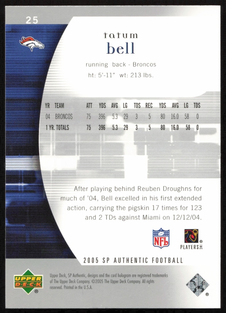 This Football card, from 2005 is part of the Upper Deck SP Authentic card set. Tatum Bell is featured and has a card number of 25.