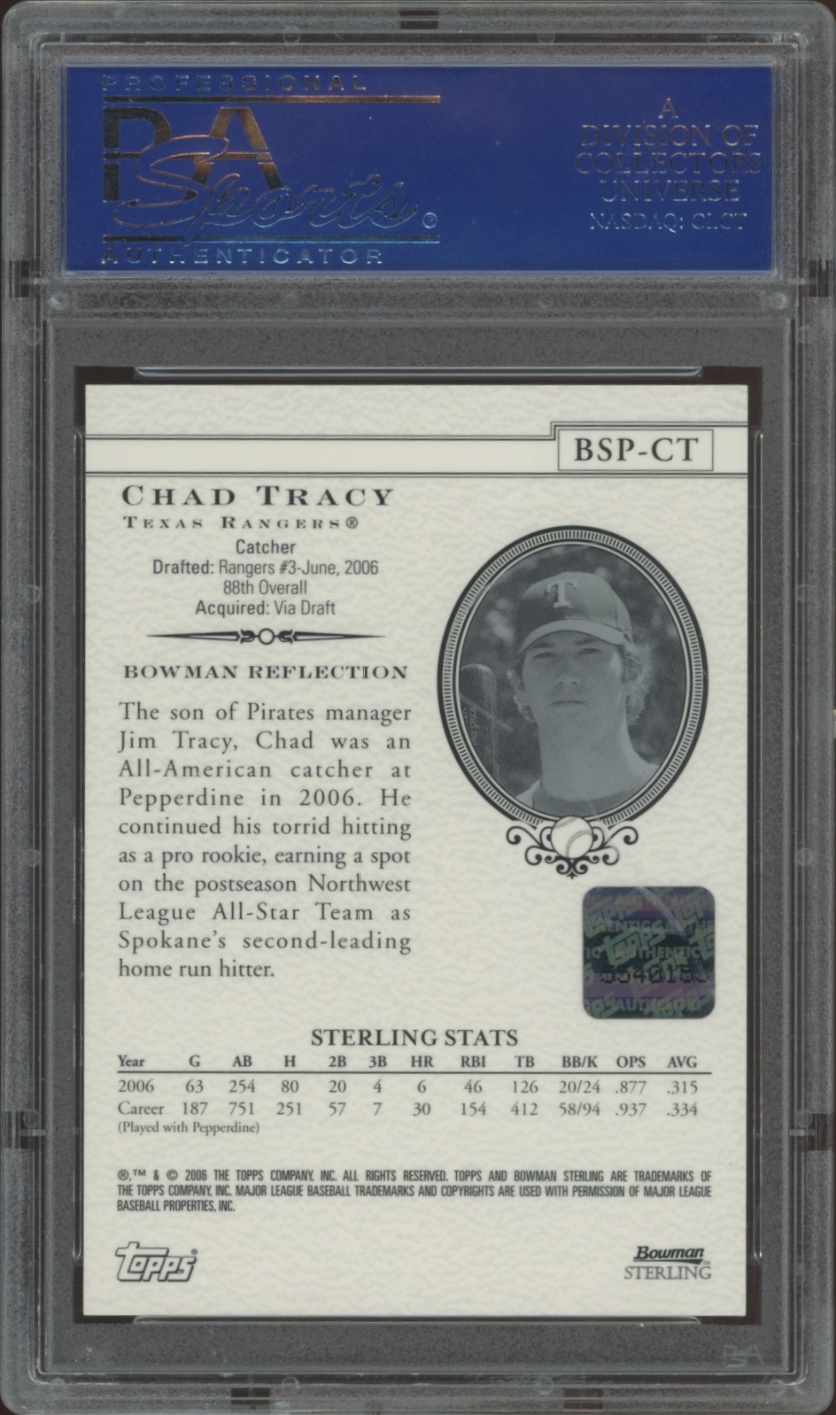 This Baseball card, from 2006 is part of the Bowman Sterling card set. Chad Tracy is featured and has a card number of BSP-CT. It is graded by PSA and has a numeric grade of 10.