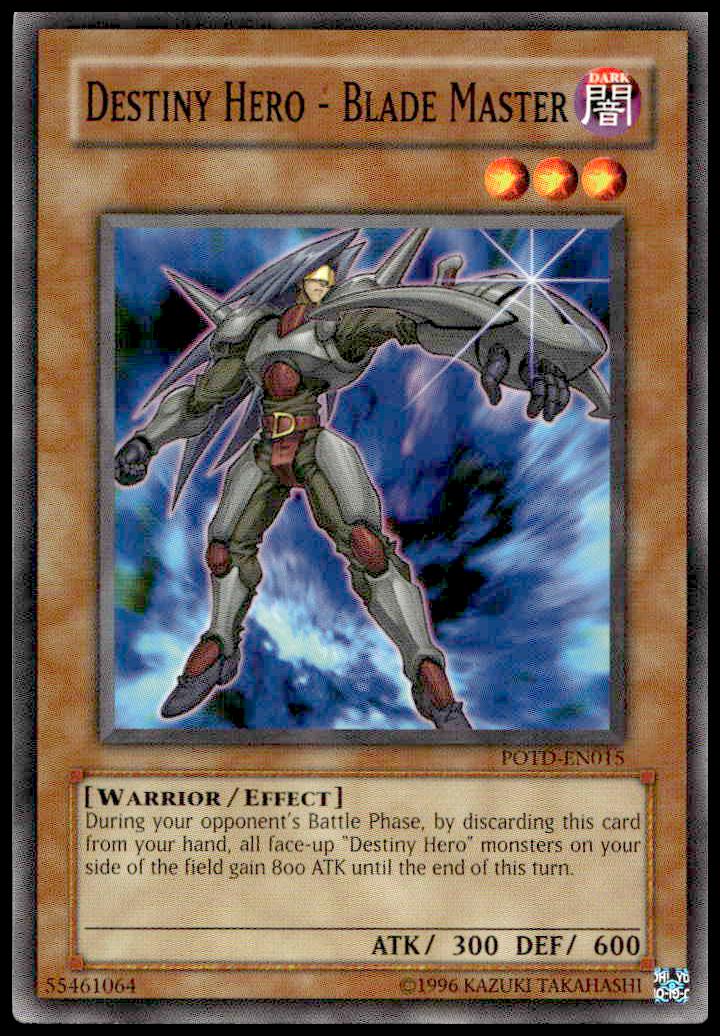 This Yu-Gi-Oh card, from 2006 is part of the Yu-Gi-Oh! Power of the Duelist card set. Destiny Hero is featured and has a card number of POTD-EN015.