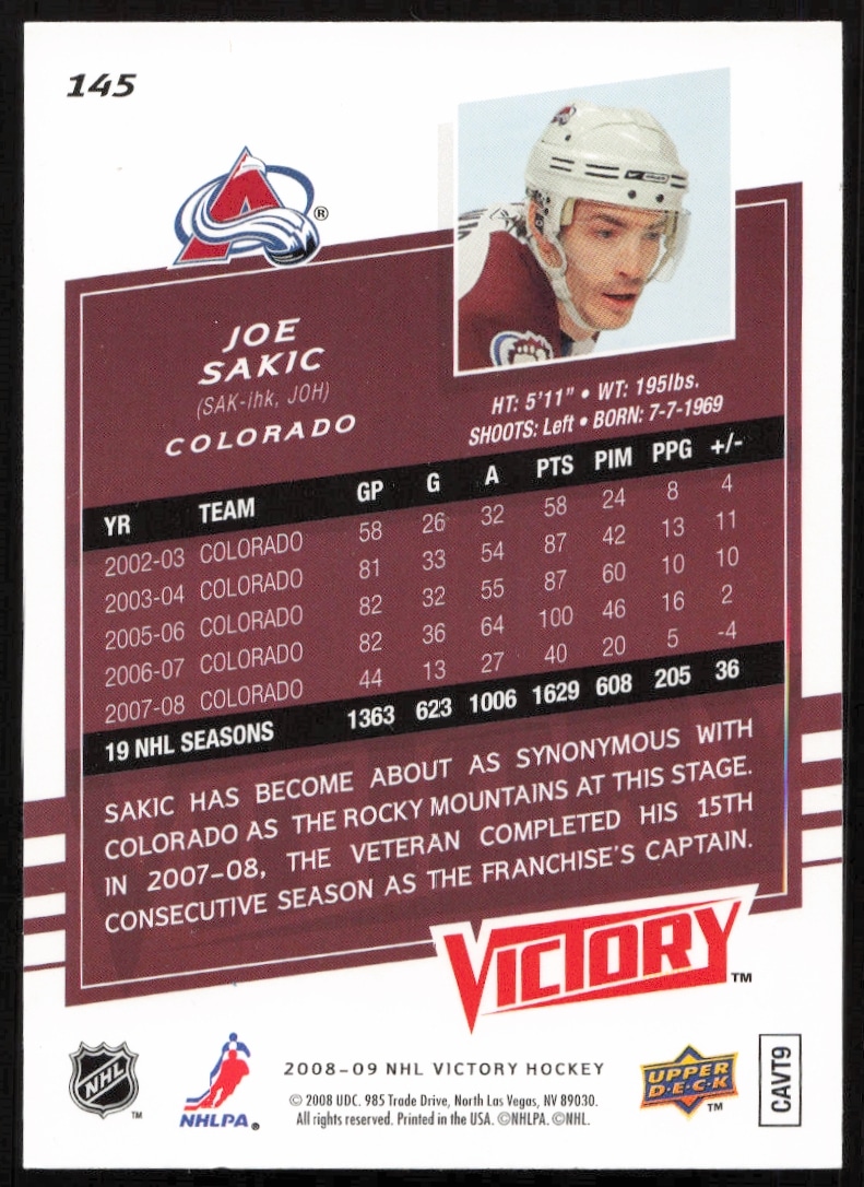 This Hockey card, from 2008-09 is part of the Upper Deck Victory card set. Joe Sakic is featured and has a card number of 145.