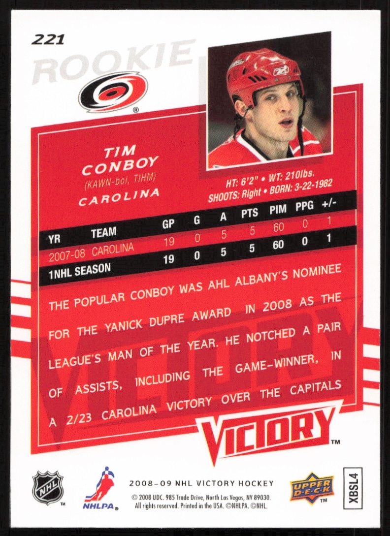 This Hockey card, from 2008-09 is part of the Upper Deck Victory card set. Tim Conboy is featured and has a card number of 221.