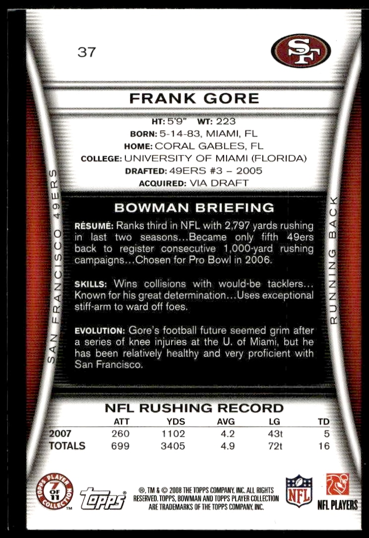 This Football card, from 2008 is part of the Bowman card set. Frank Gore is featured and has a card number of 37.