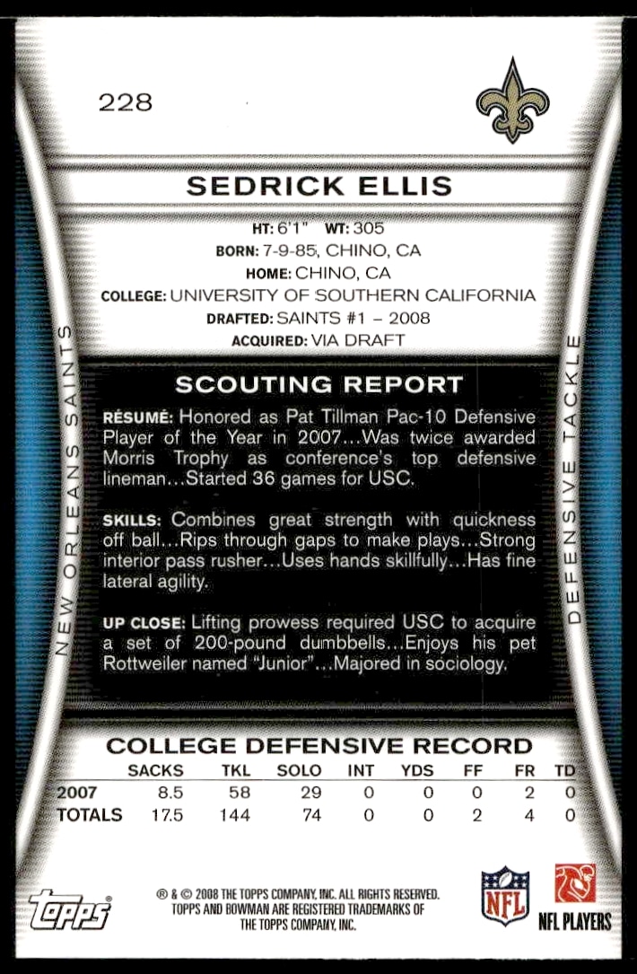 This Football card, from 2008 is part of the Bowman card set. Sedrick Ellis is featured and has a card number of 228.