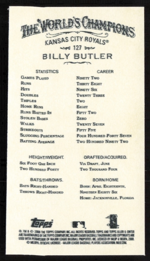 This Baseball card, from 2008 is part of the Topps Allen & Ginter card set. Billy Butler is featured and has a card number of 127.