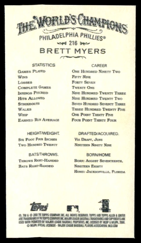 This Baseball card, from 2008 is part of the Topps Allen & Ginter card set. Brett Myers is featured and has a card number of 216.