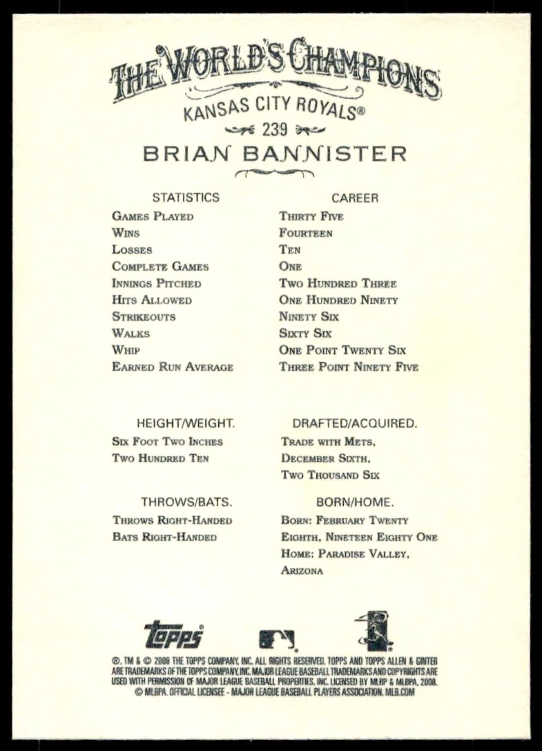 This Baseball card, from 2008 is part of the Topps Allen & Ginter card set. Brian Bannister is featured and has a card number of 239.