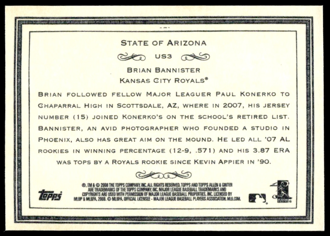 This Baseball card, from 2008 is part of the Topps Allen & Ginter card set. Brian Bannister is featured and has a card number of US3.