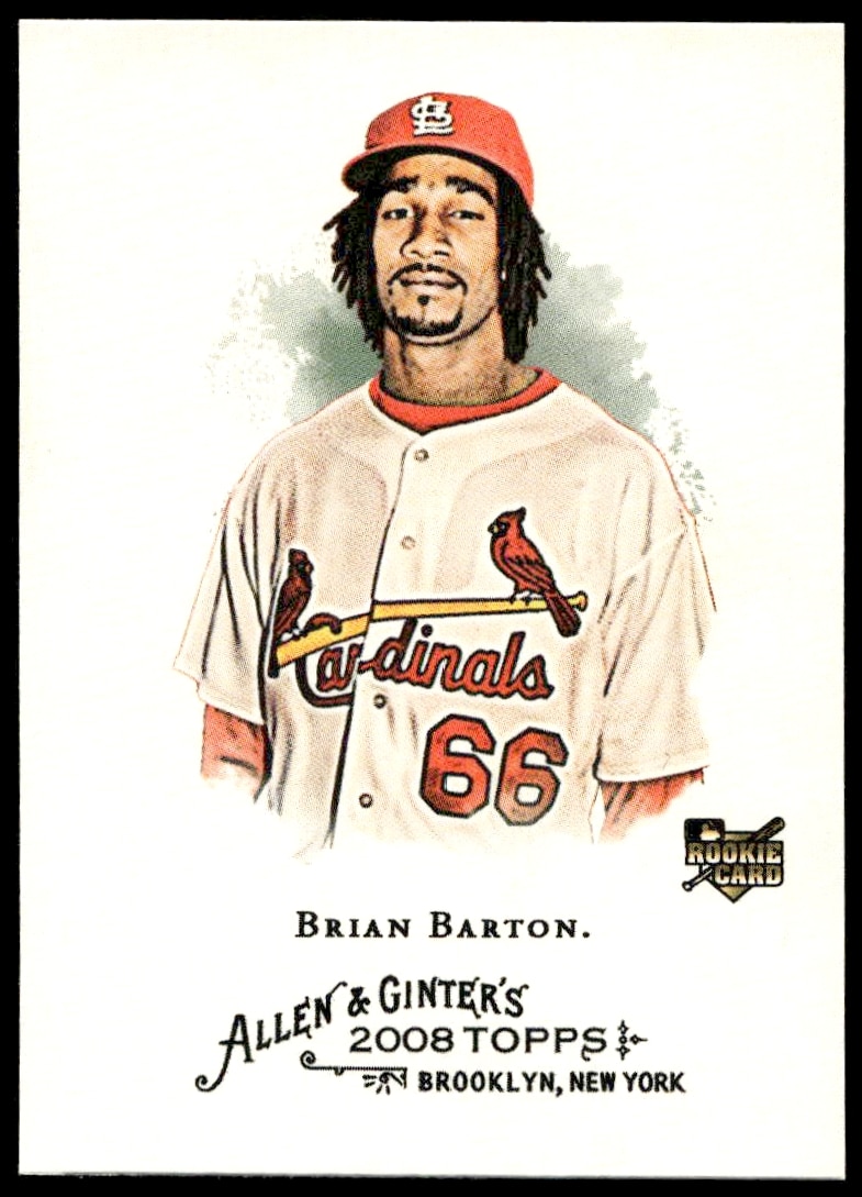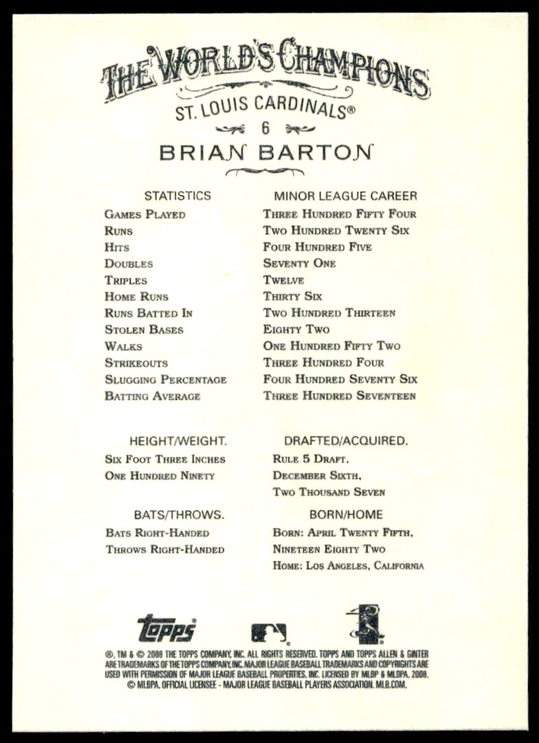 This Baseball card, from 2008 is part of the Topps Allen & Ginter card set. Brian Barton is featured and has a card number of 6.