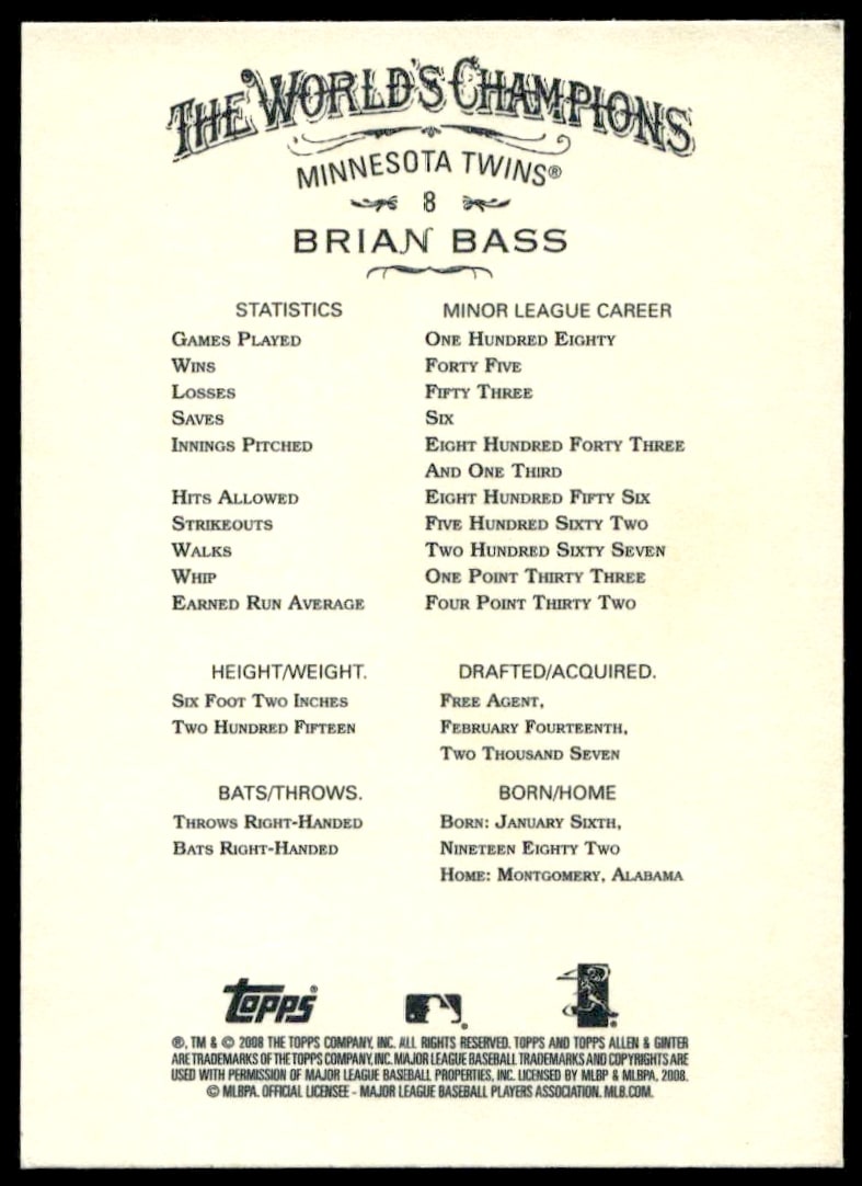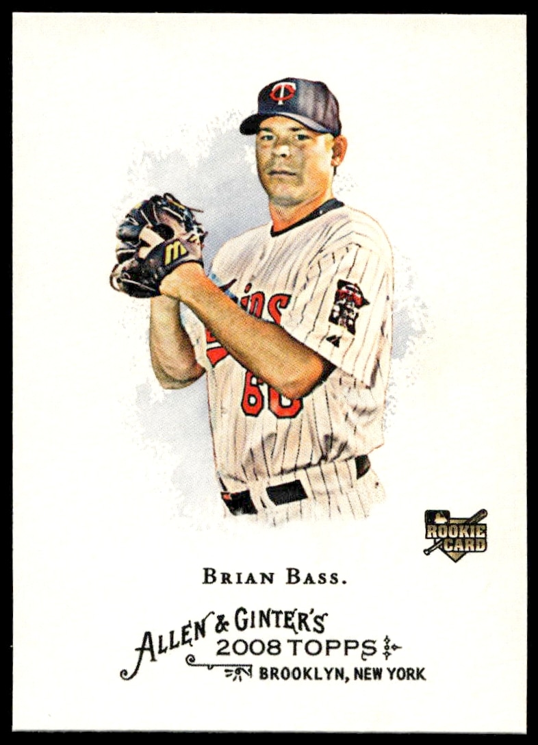 This Baseball card, from 2008 is part of the Topps Allen & Ginter card set. Brian Bass is featured and has a card number of 8.