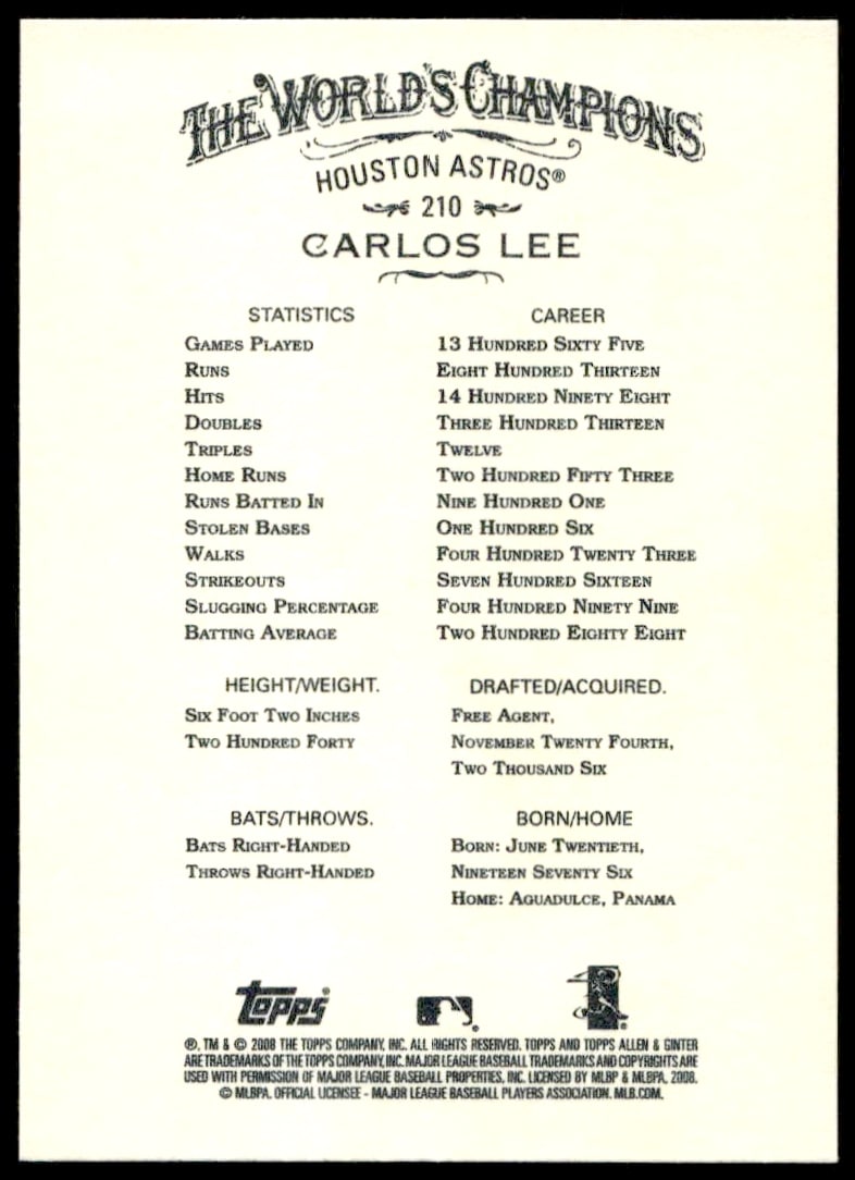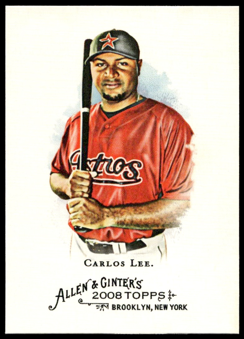 This Baseball card, from 2008 is part of the Topps Allen & Ginter card set. Carlos Lee is featured and has a card number of 210.