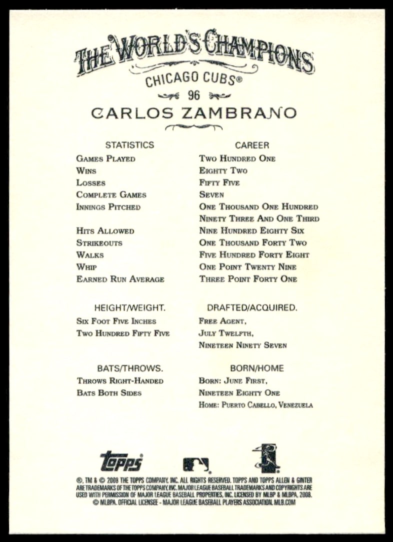 This Baseball card, from 2008 is part of the Topps Allen & Ginter card set. Carlos Zambrano is featured and has a card number of 96.