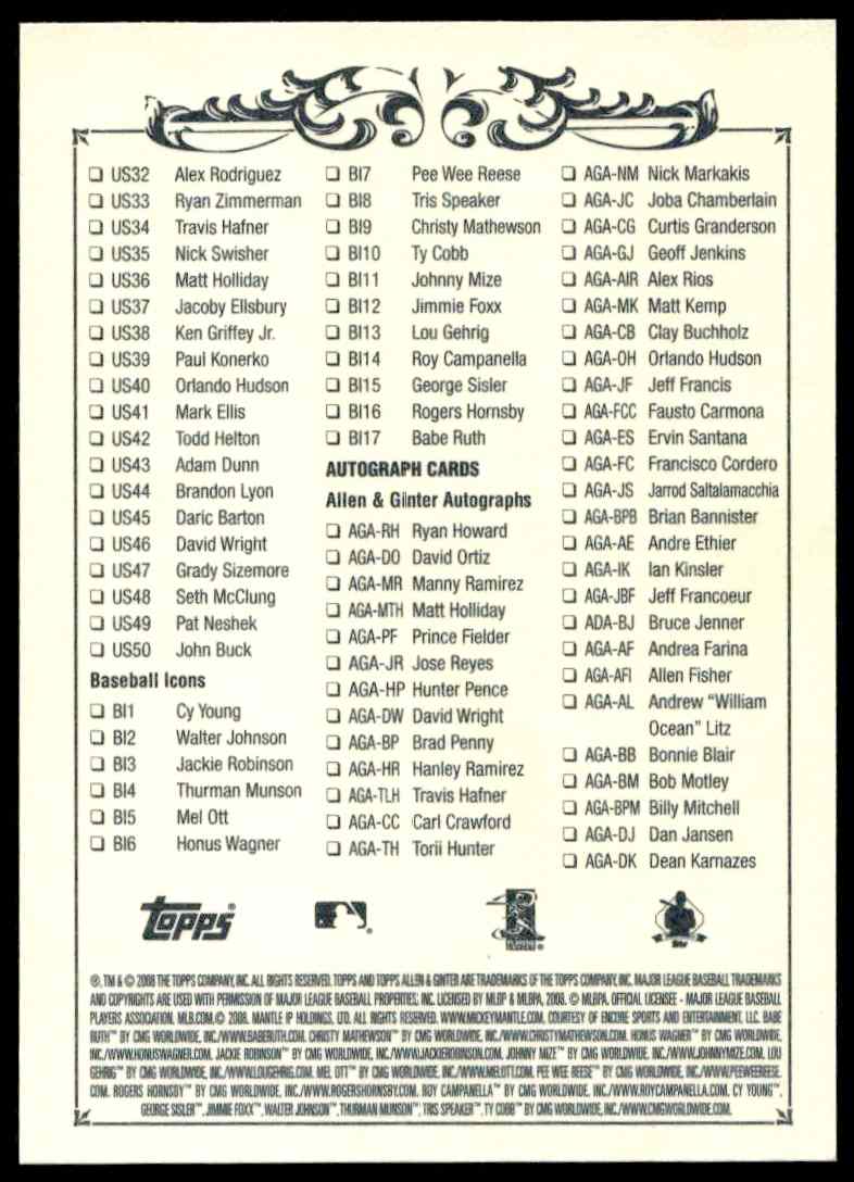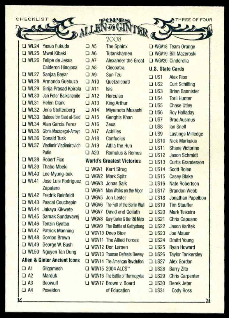 This Baseball card, from 2008 is part of the Topps Allen & Ginter card set. Checklist Three of Four: Inserts CL is featured and has a card number of 3.