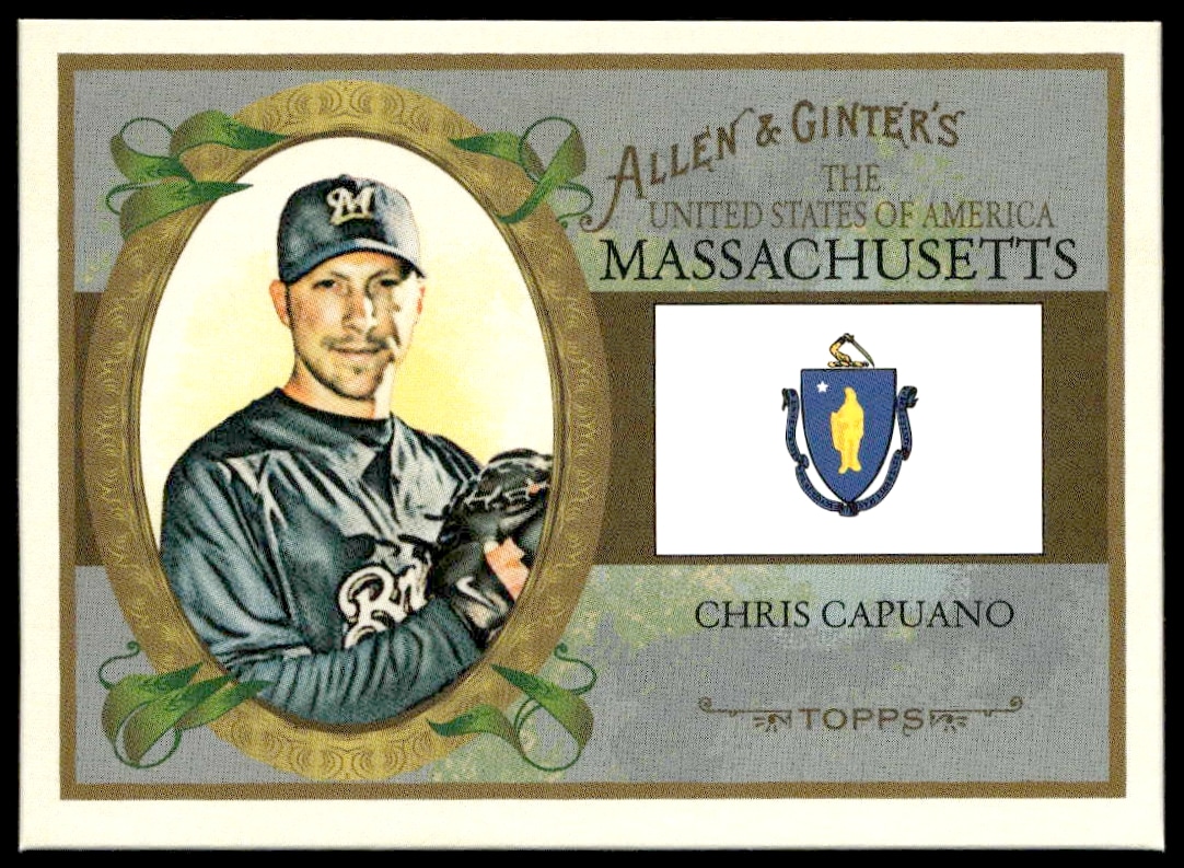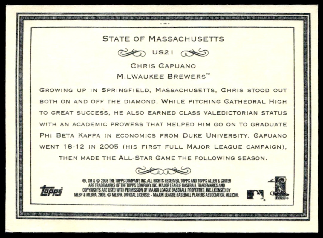 This Baseball card, from 2008 is part of the Topps Allen & Ginter card set. Chris Capuano is featured and has a card number of US21.
