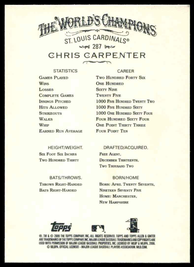 This Baseball card, from 2008 is part of the Topps Allen & Ginter card set. Chris Carpenter is featured and has a card number of 287.