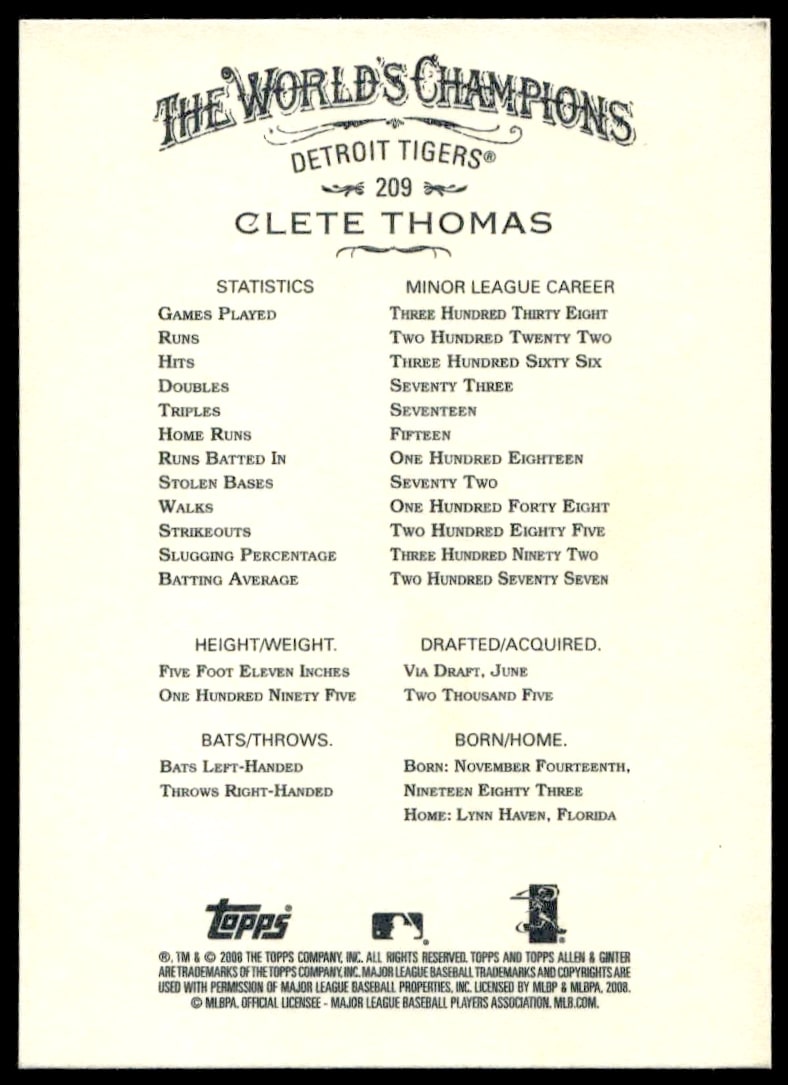This Baseball card, from 2008 is part of the Topps Allen & Ginter card set. Clete Thomas is featured and has a card number of 209.