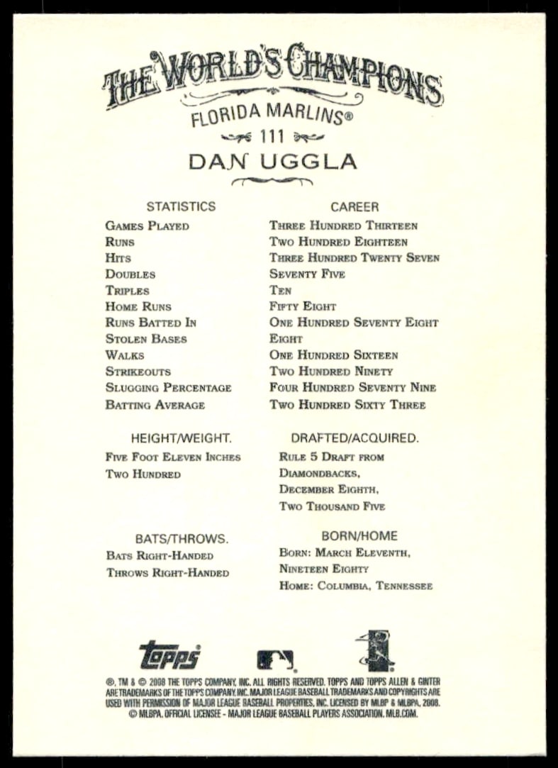 This Baseball card, from 2008 is part of the Topps Allen & Ginter card set. Dan Uggla is featured and has a card number of 111.