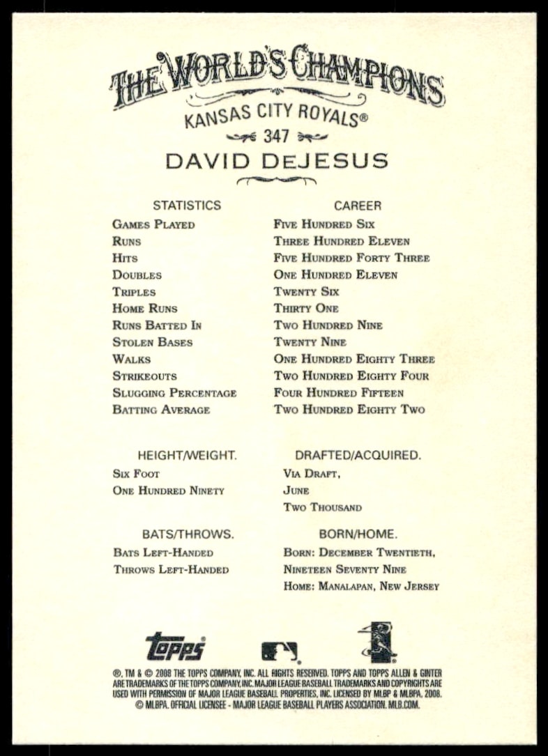 This Baseball card, from 2008 is part of the Topps Allen & Ginter card set. David DeJesus is featured and has a card number of 347.