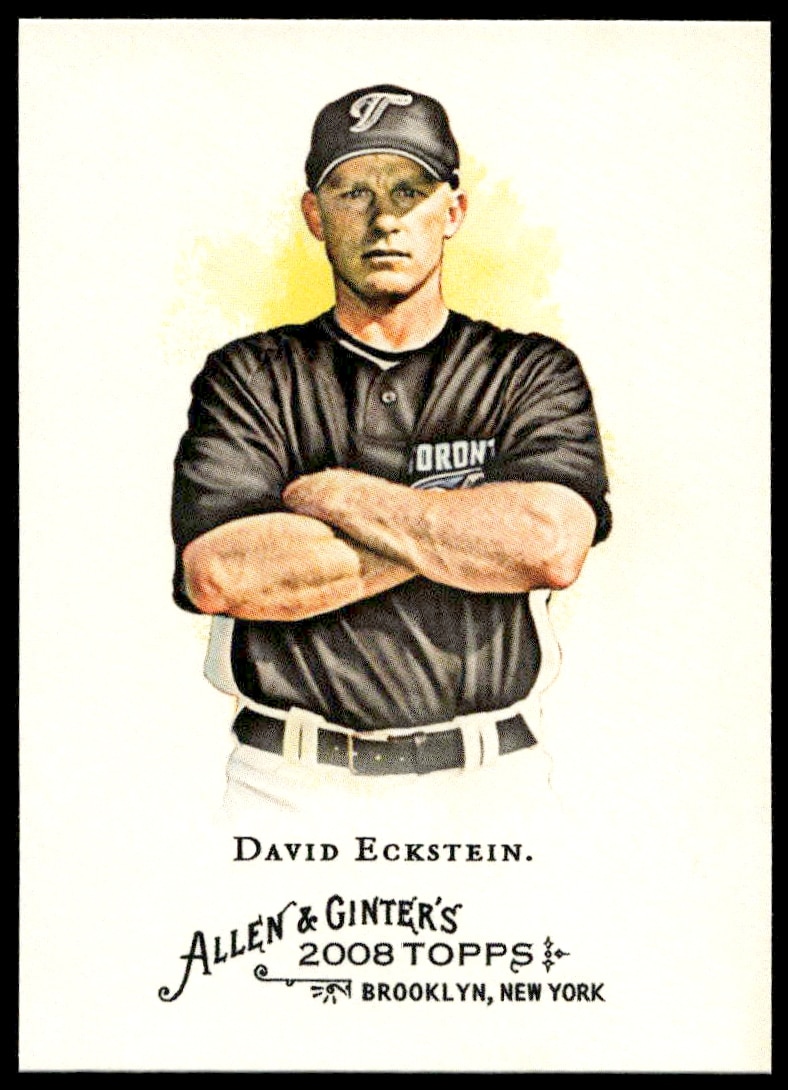 This Baseball card, from 2008 is part of the Topps Allen & Ginter card set. David Eckstein is featured and has a card number of 93.