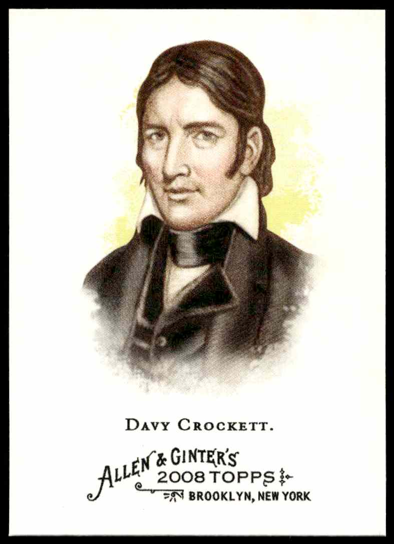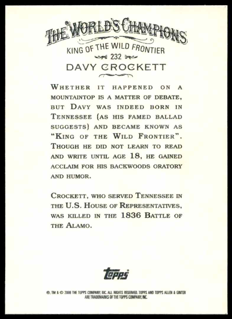 This Baseball card, from 2008 is part of the Topps Allen & Ginter card set. Davy Crockett is featured and has a card number of 232.