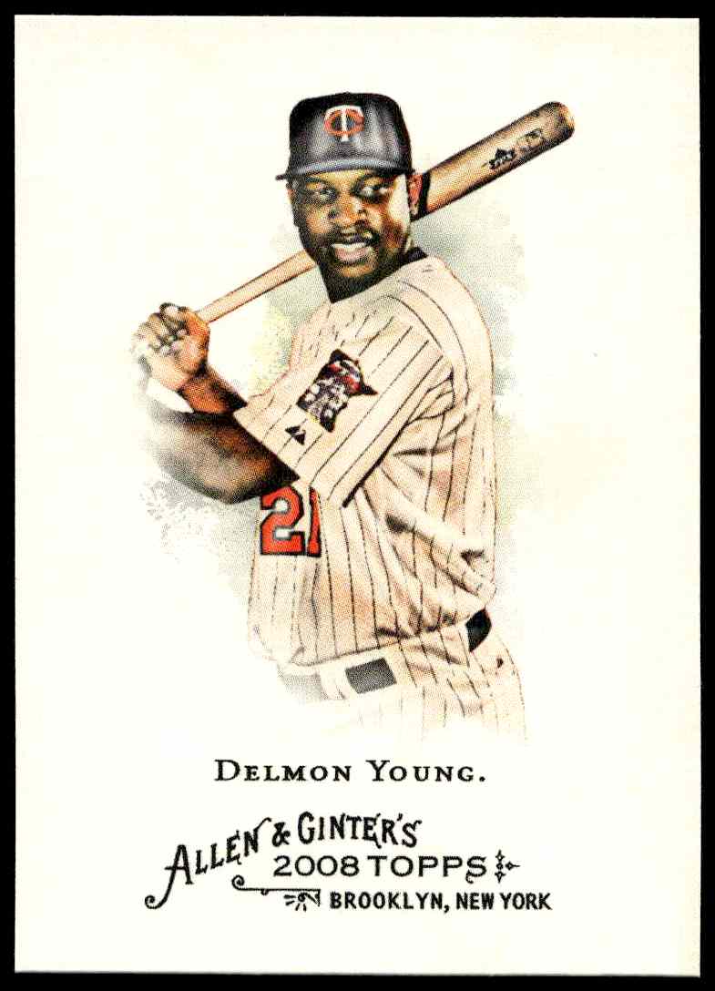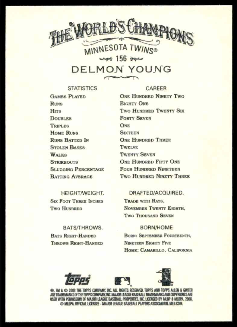 This Baseball card, from 2008 is part of the Topps Allen & Ginter card set. Delmon Young is featured and has a card number of 156.