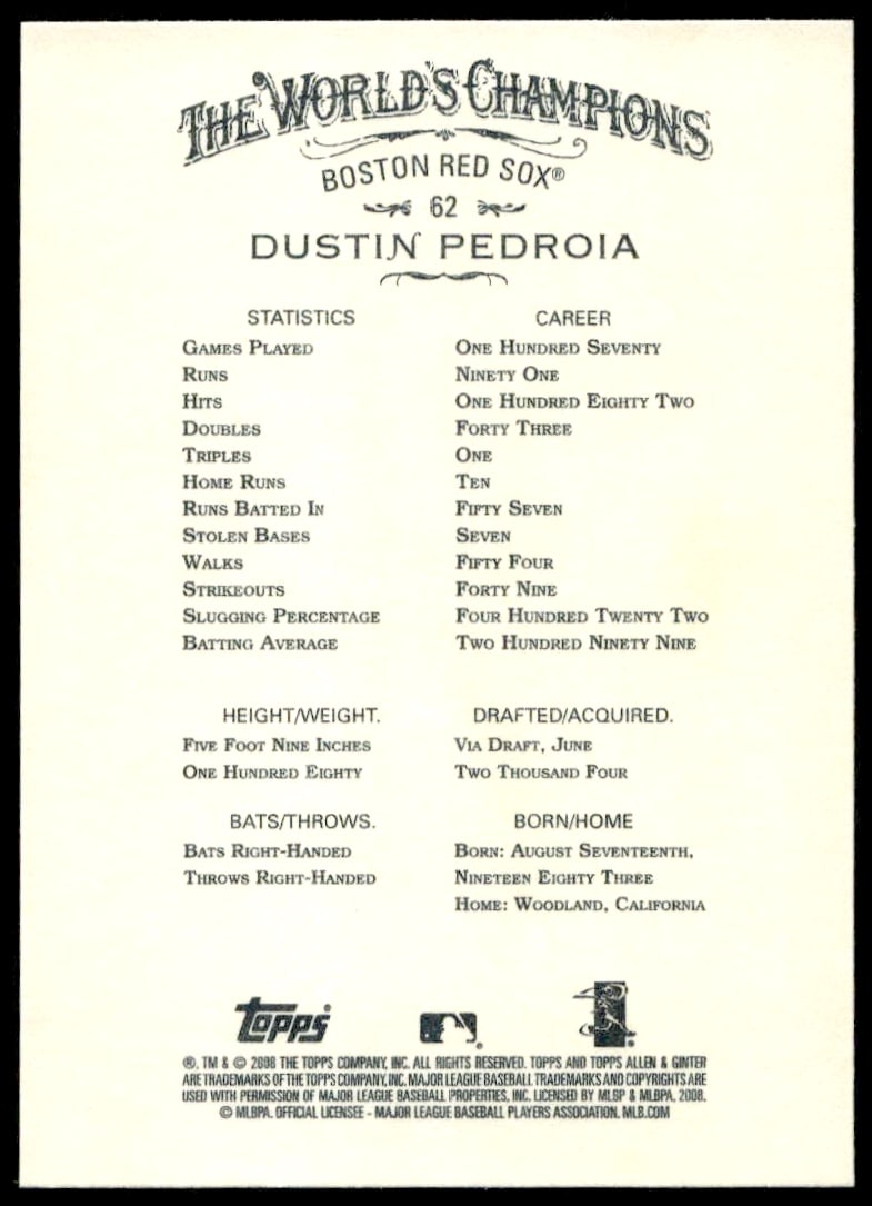 This Baseball card, from 2008 is part of the Topps Allen & Ginter card set. Dustin Pedroia is featured and has a card number of 62.