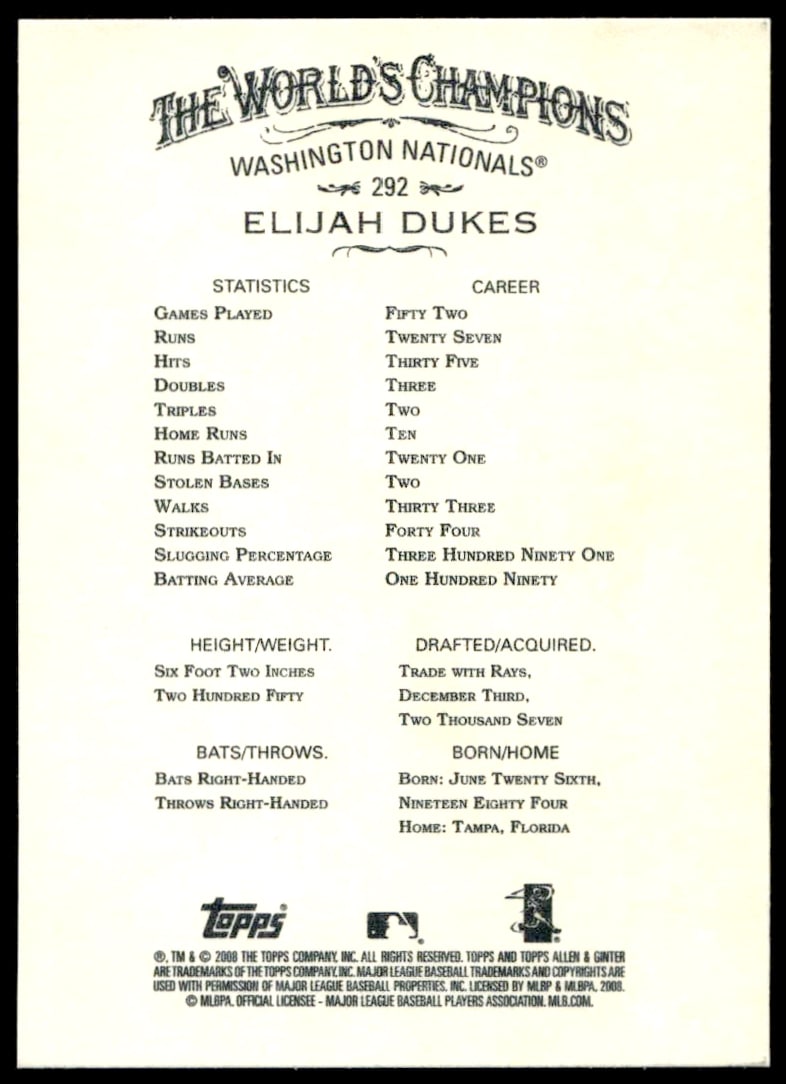 This Baseball card, from 2008 is part of the Topps Allen & Ginter card set. Elijah Dukes is featured and has a card number of 292.