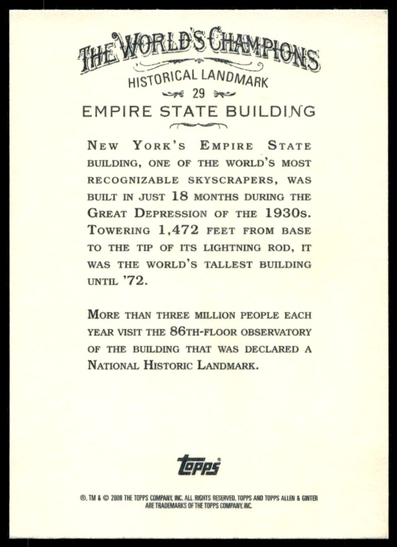 This Baseball card, from 2008 is part of the Topps Allen & Ginter card set. Empire State Building is featured and has a card number of 29.