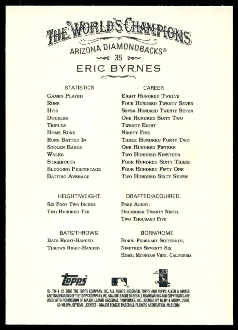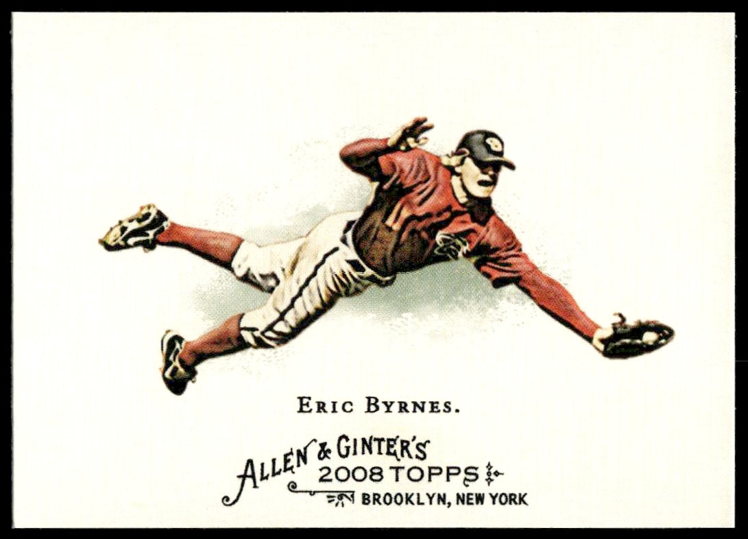 This Baseball card, from 2008 is part of the Topps Allen & Ginter card set. Eric Byrnes is featured and has a card number of 35.