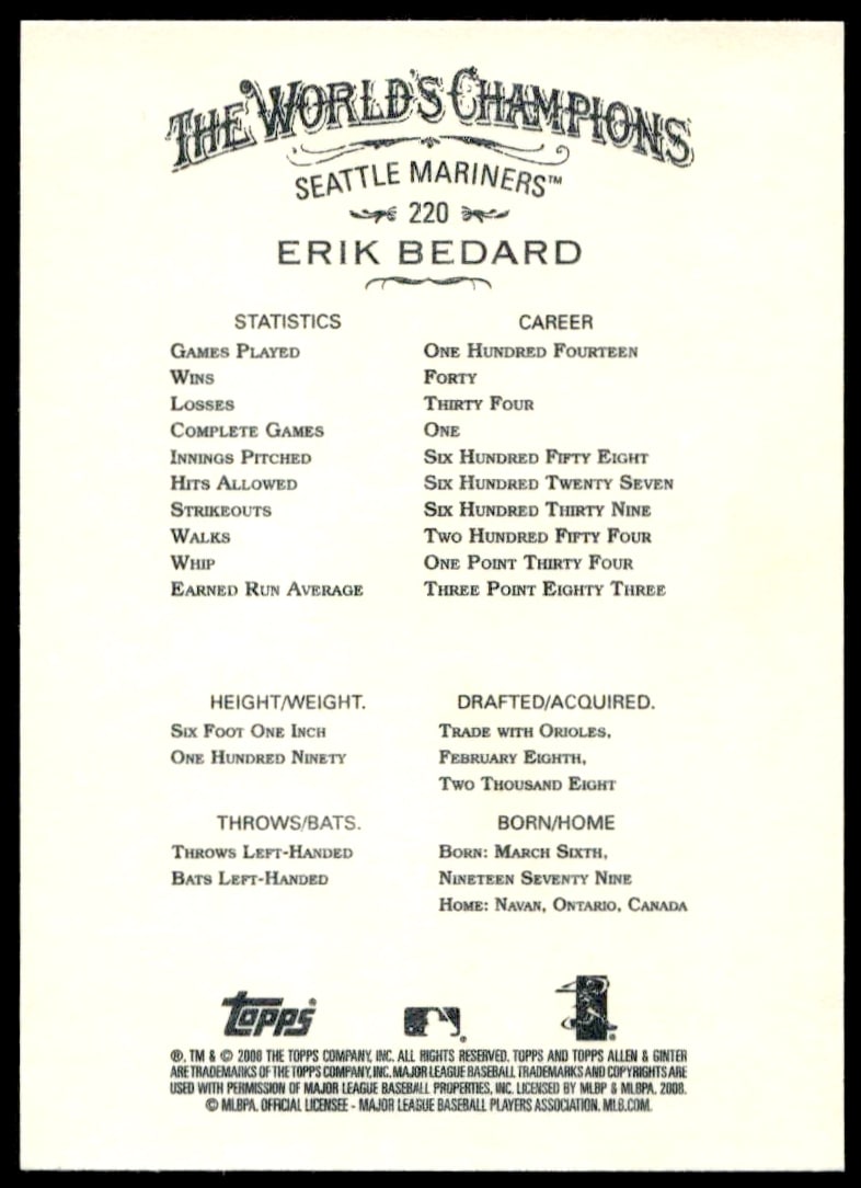 This Baseball card, from 2008 is part of the Topps Allen & Ginter card set. Erik Bedard is featured and has a card number of 220.