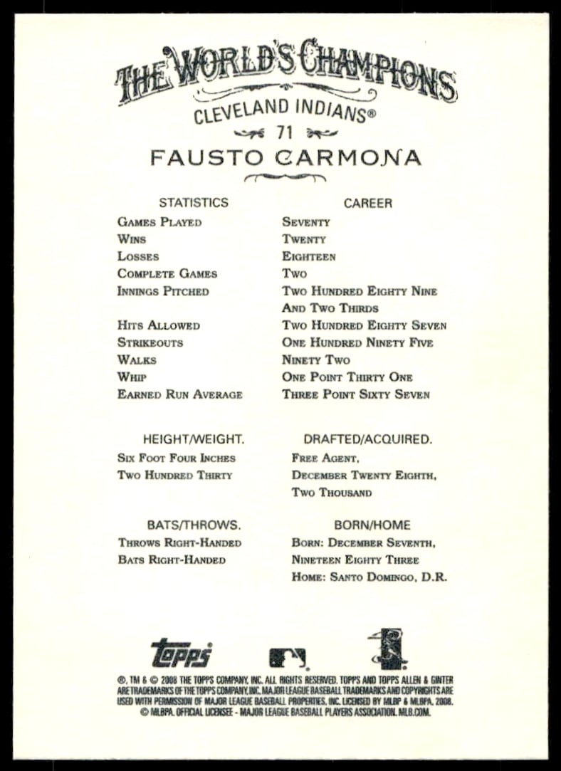 This Baseball card, from 2008 is part of the Topps Allen & Ginter card set. Fausto Carmona is featured and has a card number of 71.