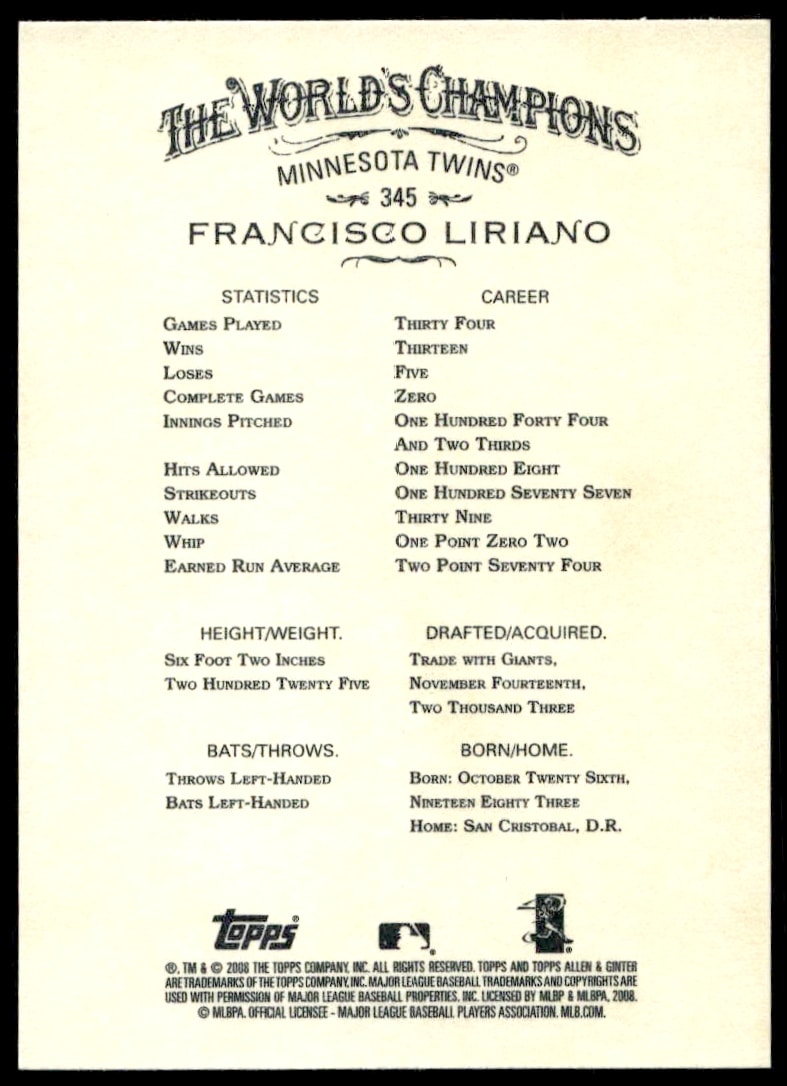 This Baseball card, from 2008 is part of the Topps Allen & Ginter card set. Francisco Liriano is featured and has a card number of 345.