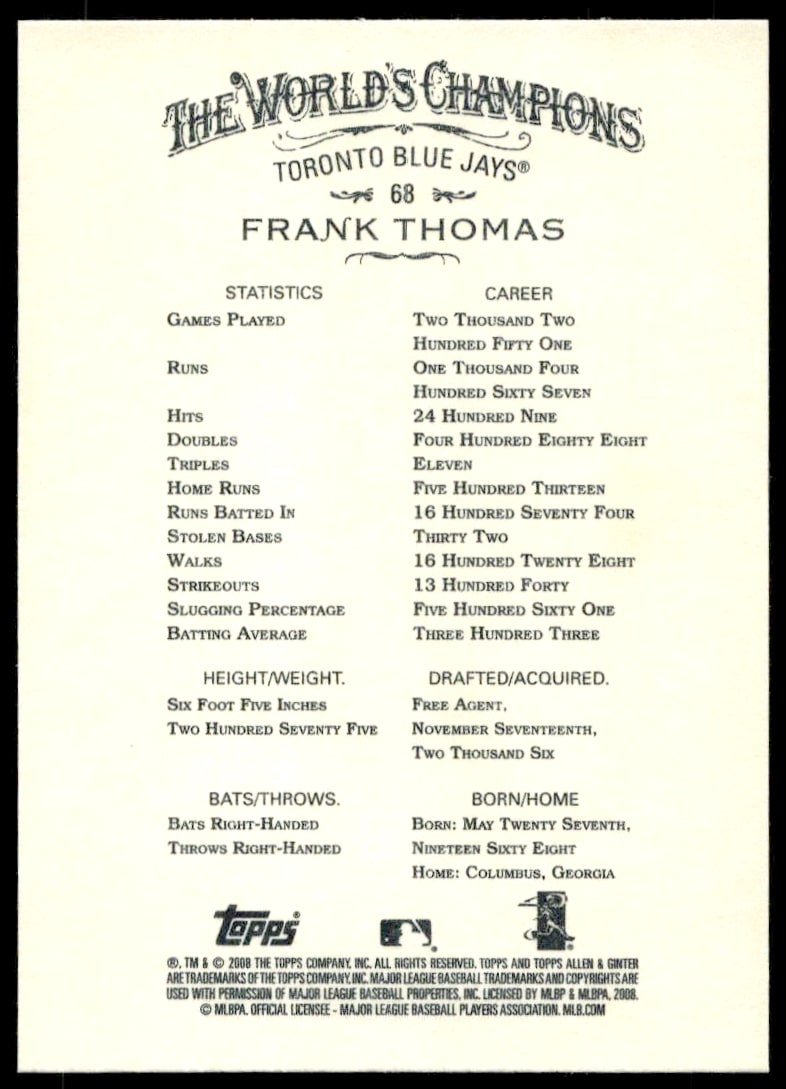 This Baseball card, from 2008 is part of the Topps Allen & Ginter card set. Frank Thomas is featured and has a card number of 68.