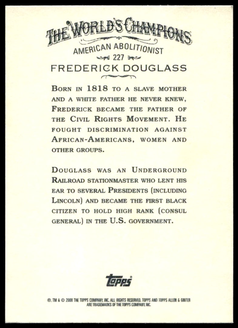 This Baseball card, from 2008 is part of the Topps Allen & Ginter card set. Frederick Douglass is featured and has a card number of 227.