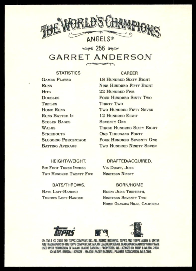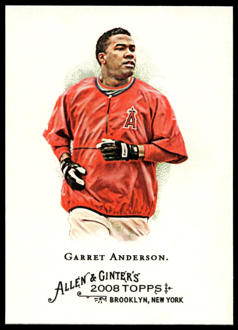 This Baseball card, from 2008 is part of the Topps Allen & Ginter card set. Garret Anderson is featured and has a card number of 256.