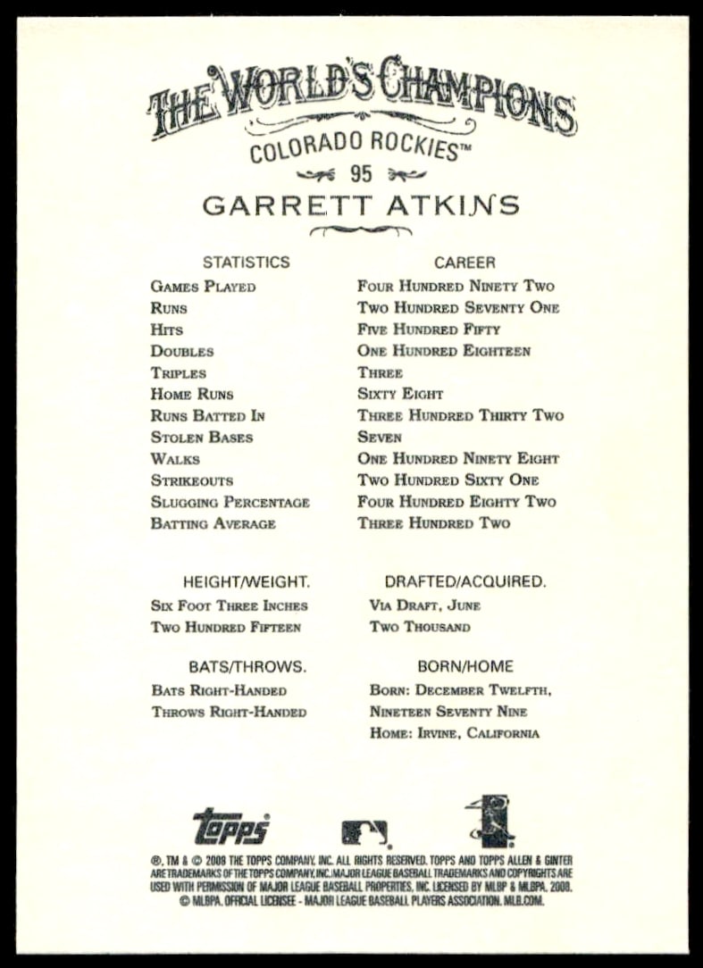 This Baseball card, from 2008 is part of the Topps Allen & Ginter card set. Garrett Atkins is featured and has a card number of 95.