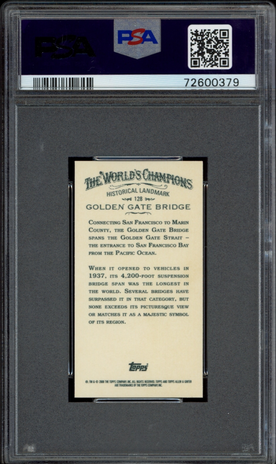 This 2008 Topps Allen & Ginter mini card features the Golden Gate Bridge, with a striking black border and a PSA 9 grade for collectors.