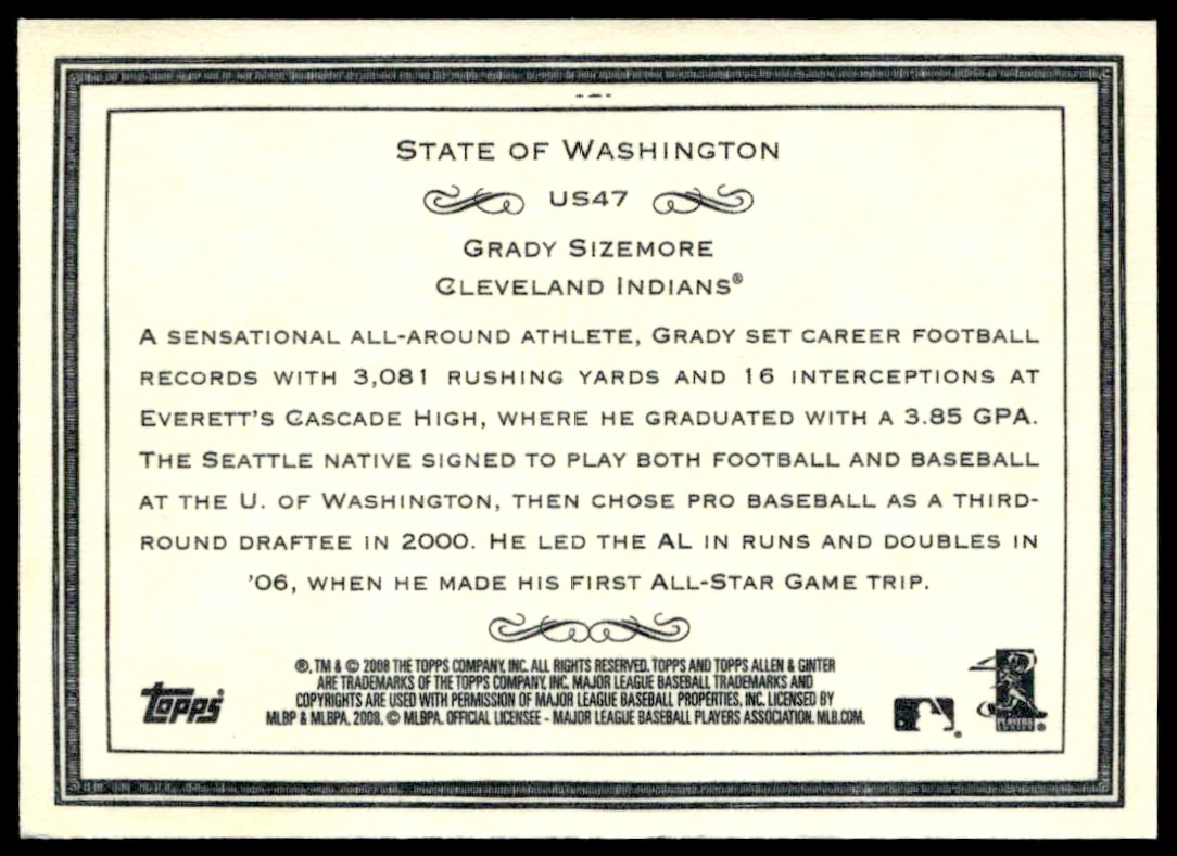 This Baseball card, from 2008 is part of the Topps Allen & Ginter card set. Grady Sizemore is featured and has a card number of US47.