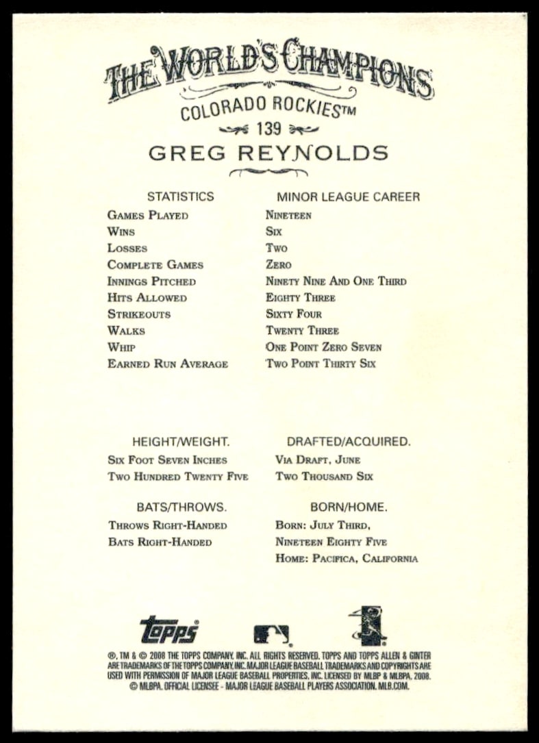 This Baseball card, from 2008 is part of the Topps Allen & Ginter card set. Greg Reynolds is featured and has a card number of 139.