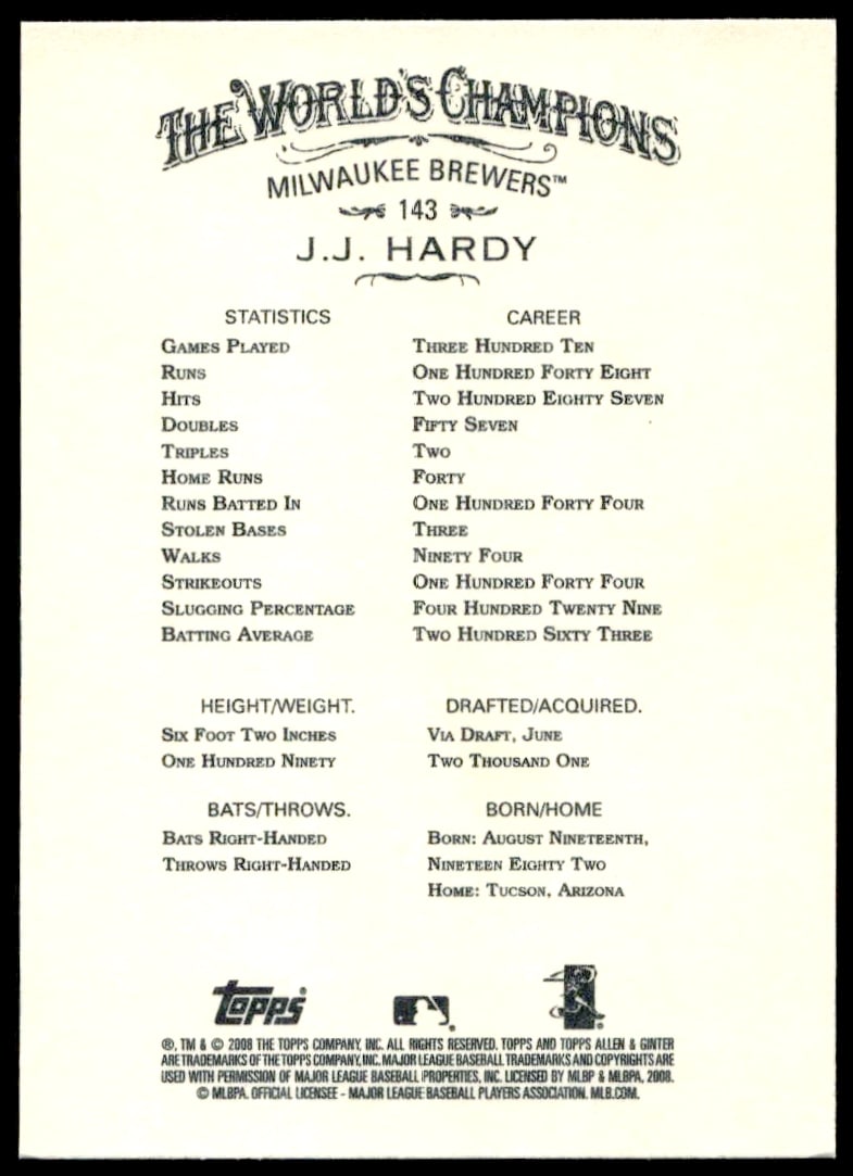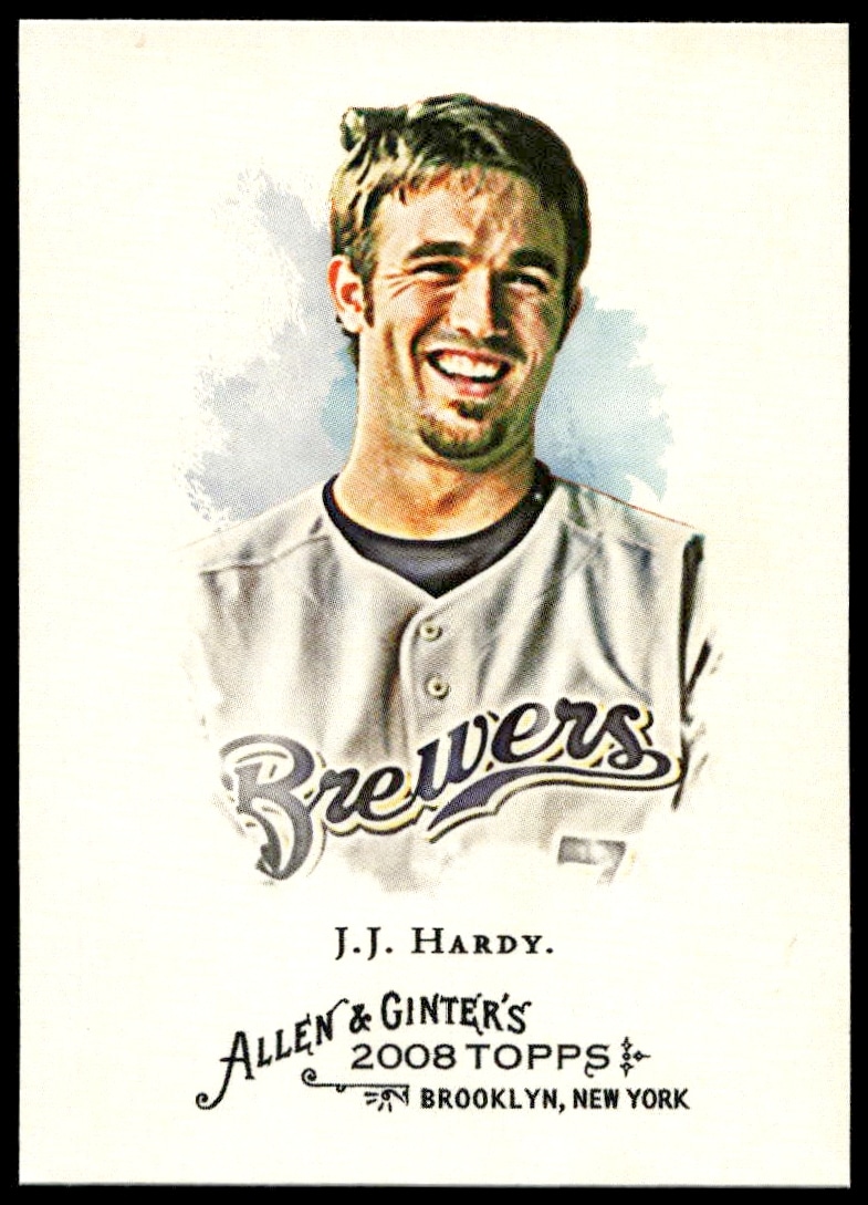 This Baseball card, from 2008 is part of the Topps Allen & Ginter card set. J.J. Hardy is featured and has a card number of 143.