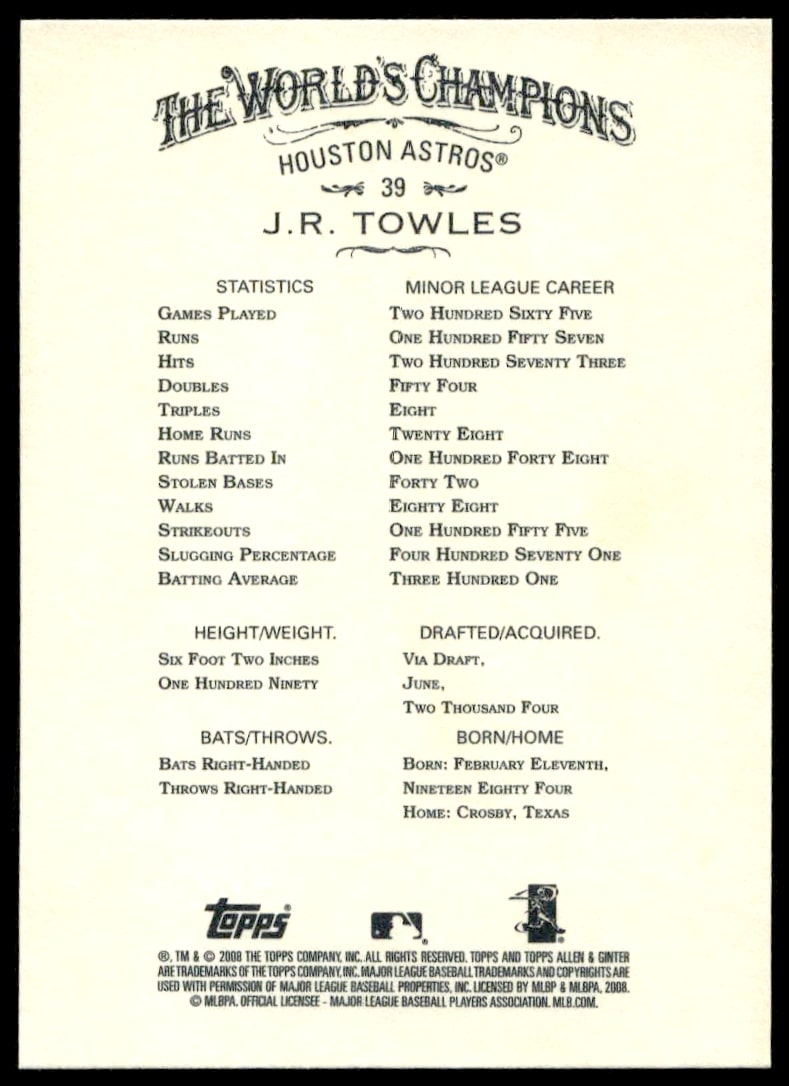 This Baseball card, from 2008 is part of the Topps Allen & Ginter card set. J.R. Towles is featured and has a card number of 39.