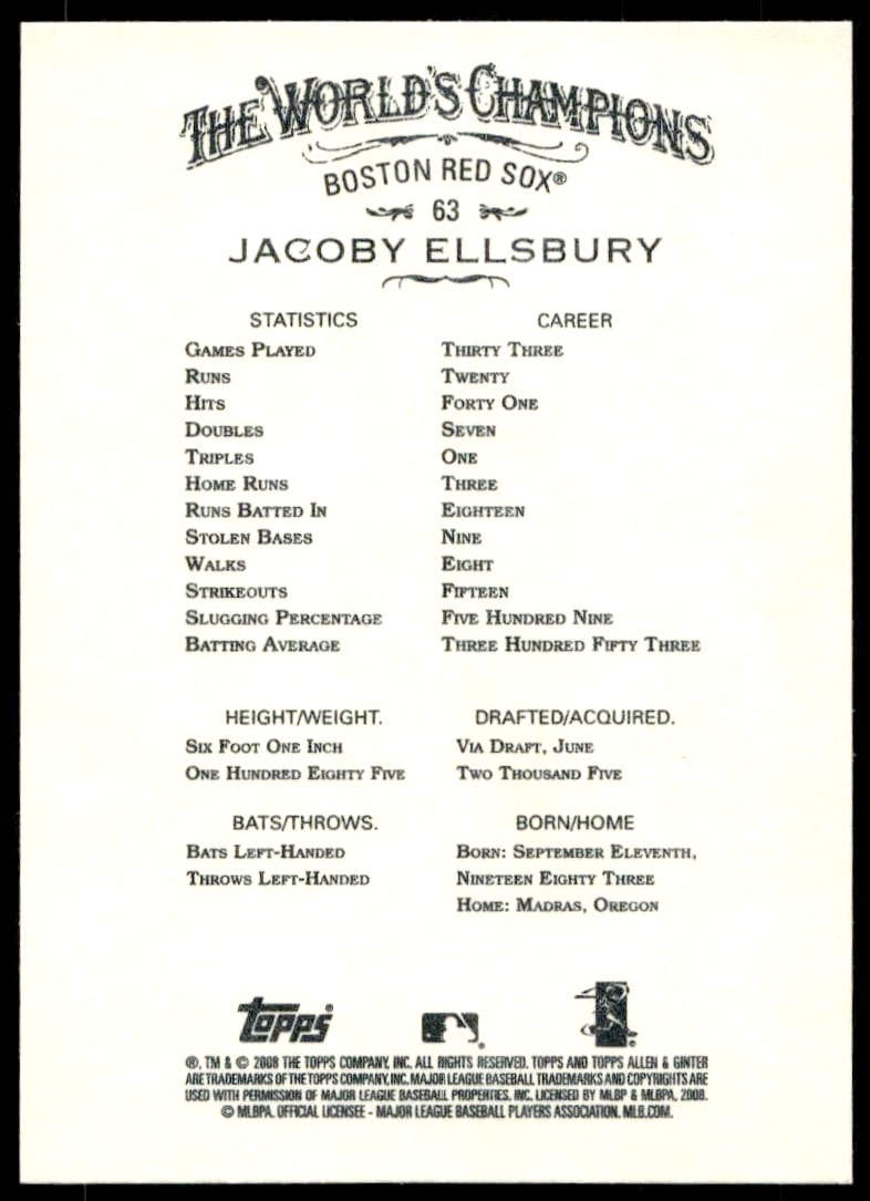 This Baseball card, from 2008 is part of the Topps Allen & Ginter card set. Jacoby Ellsbury is featured and has a card number of 63.