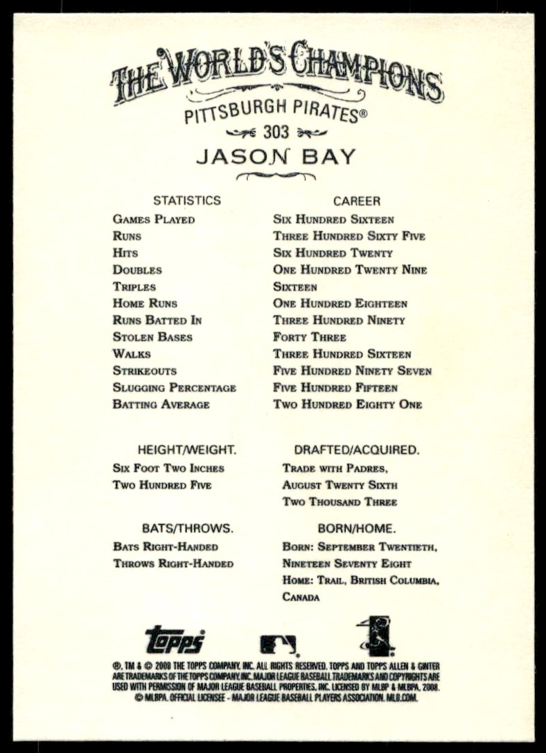 This Baseball card, from 2008 is part of the Topps Allen & Ginter card set. Jason Bay is featured and has a card number of 303.
