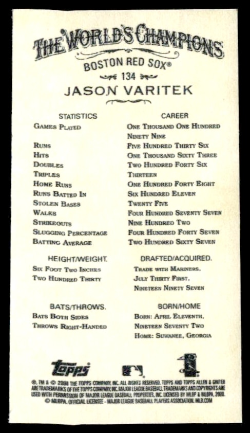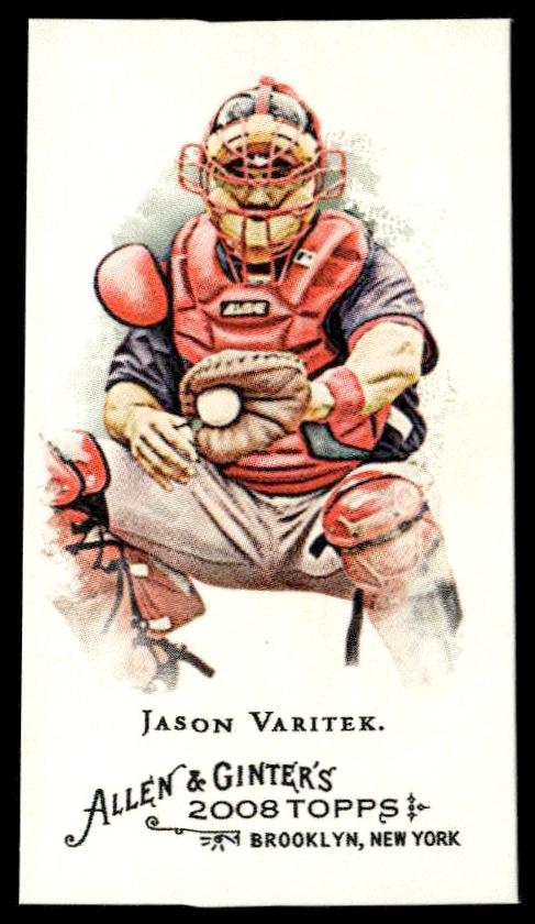 This Baseball card, from 2008 is part of the Topps Allen & Ginter card set. Jason Varitek is featured and has a card number of 134.